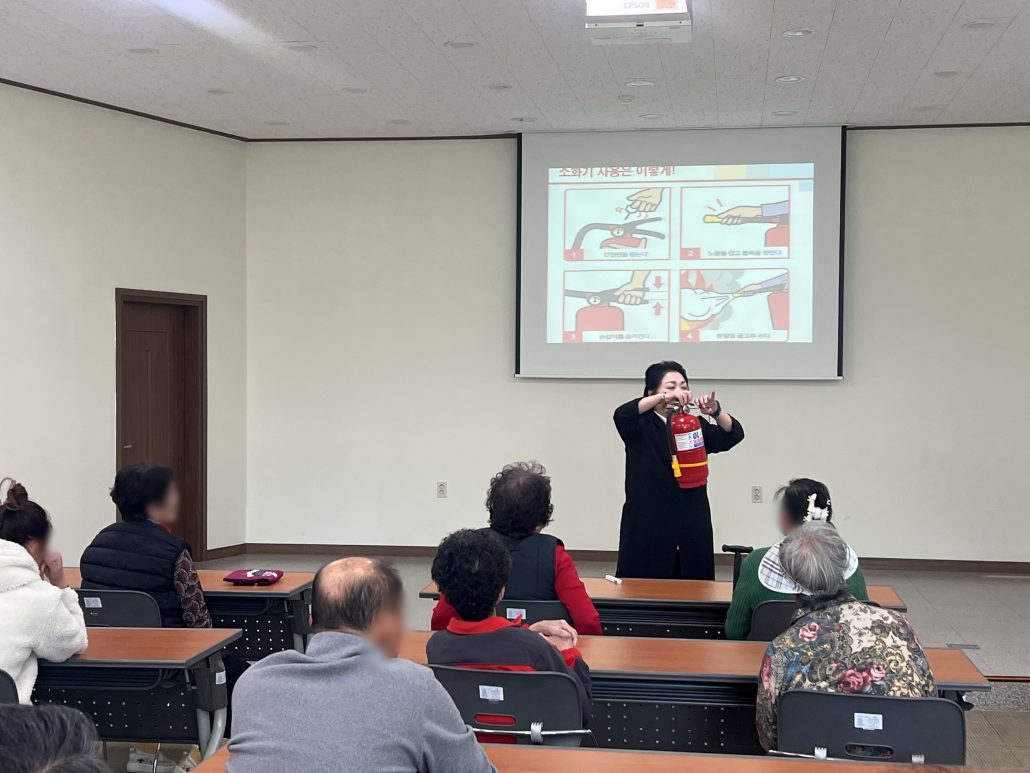 강사님께서는 어르신들이 이해하기 쉽도록 실제 사례를 들어 설명해주셨고, 질의응답을 통해 소통하며 전문적으로 교육을 이끌어가셨습니다. 또한, 실제 소화기까지 준비해 설명하는 열정적인 모습도 보여주셨고, 이에 어르신들께서도 끝까지 교육에 집중하며 적극적으로 참여해주셨습니다.